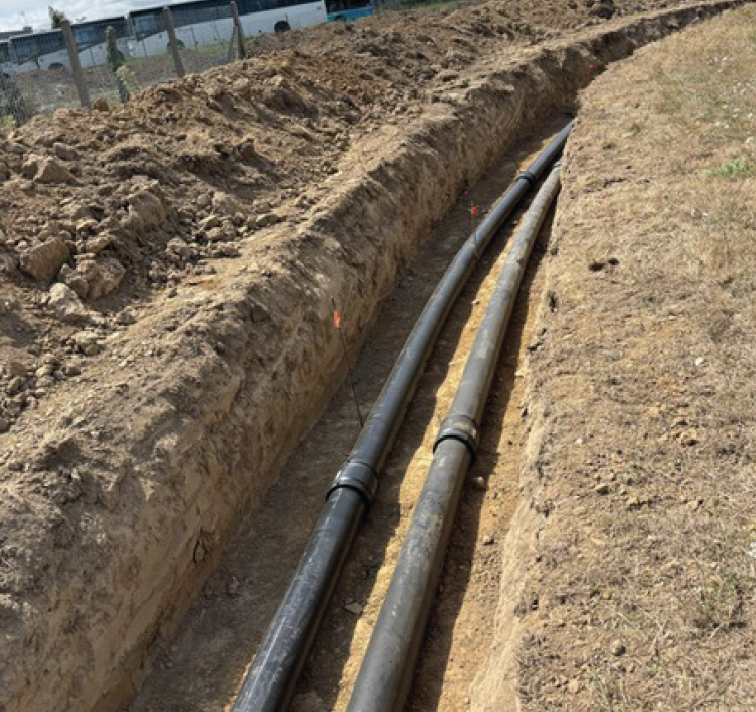 Dans le cadre de ce projet, 64 sondes géothermiques spiralées de 115 mètres de profondeur ont été installées par les équipes d’Aquassys Dol Forage, soit près de 7 400 mètres linéaires forés dans les délais impartis.